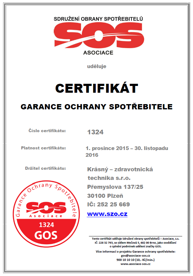 Sdružení obrany spotřebitelů – Asociace, z.s. (SOS – Asociace) je nestátní nezisková organizace založená za účelem pomáhat spotřebitelům a prosazovat jejich práva. Od roku 2003 bezplatně pomáhá spotřebitelům z celé České republiky. Dne 1.12.2015 získala naše společnost Krásný - zdravotnická technika s.r.o. od SOS Asociace certifikát Garance ochrany spotřebitele.